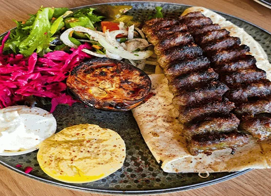 Minced Lamb Skewers seasoned with authentic spices + Sumac Salad + Tzatziki and Hommus